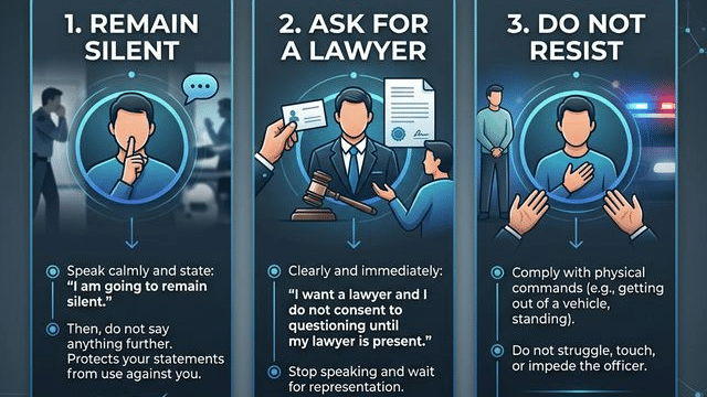 If you are placed under arrest, your adrenaline will spike. Remember the three golden rules: Do not resist the physical arrest (even if you are completely innocent, resisting can lead to felony charges), invoke your right to remain silent, and demand to speak to your attorney immediately.